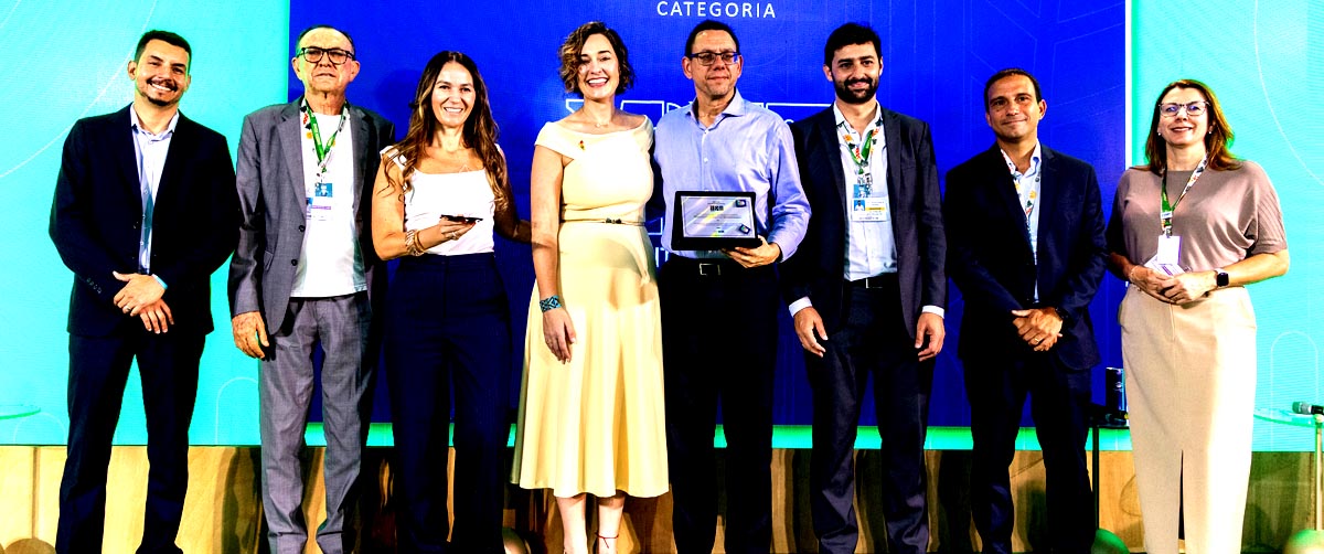 A foto mostra o CEO da VLI, Fábio Marchiori (ao centro), e a diretora-executiva de Gente, Serviços e Sustentabilidade da VLI, Rute Melo Araújo (terceira da esquerda para a direita), recebem o selo Diamante do Pacto pela Sustentabilidade, do Ministério dos Portos.