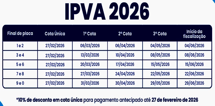 Os proprietários de veículos que optarem pelo parcelamento do IPVA 2026 realizarão o pagamento da primeira cota de acordo com o final da placa dos veículos, conforme tabela abaixo.