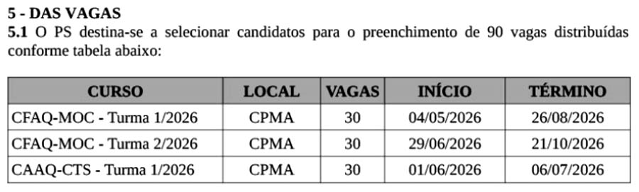 A primeira fase do concurso é uma prova objetiva, de caráter eliminatório e classificatório, com 50 questões de Matemática, Português, Ciências (Física e Química) e Inglês. Os aprovados seguem para etapas complementares, que incluem inspeção de saúde, teste de aptidão física (TAF), avaliação psicológica, verificação de dados biográficos e checagem de documentos.