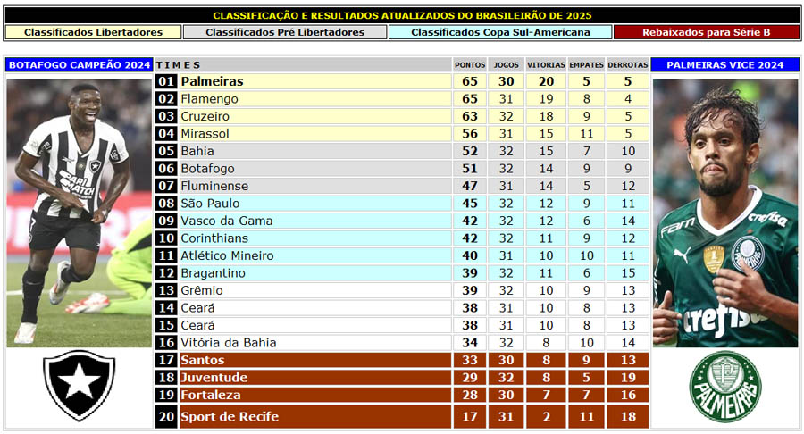 Com o final do Brasileirão, quatro equipes – Santos, Mirassol, Sport de Recife e Ceará. – vão disputar s Série A em 2025. Outras quatro caíram para a Série B – Athletico Paranaense, Criciúma, Atlético de Goiás e Cuiabá