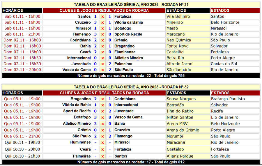 Confira a seguir a classificação final do Brasileirão de 2024 e os resultados da última e decisiva rodada, assim como a lista de todos os campões brasileiros d futebol desde o ano de 1959 até 2024.