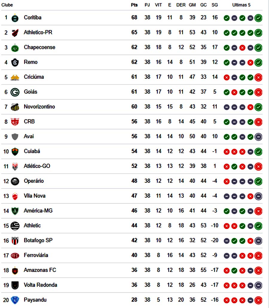 Com o resultado, o Athletico-PR terminou na vice-liderança, com 65 pontos, a três do Coritiba. O G-4 da Série B do Brasileirão foi completado por Chapecoense e Remo.