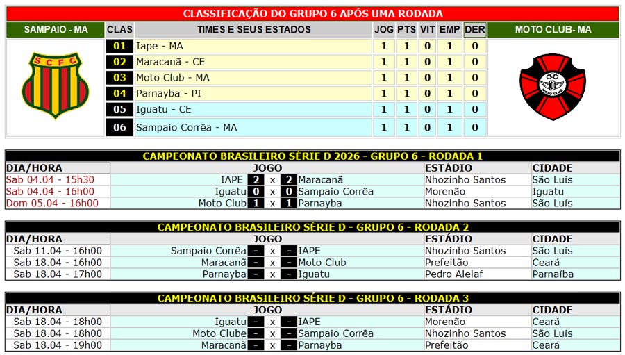 Depois da primeira rodada, tanto Sampaio Corrêa, quanto Moto Club, Iape e Imperatriz empataram seus jogos
