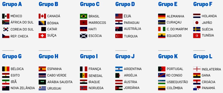 Canada, Estados Unidos e México vão sediar a Copa do Mundo de 2026. 48 seleções estarão brigando pelo caneco mais disputado do futebol. A Copa do Mundo de 2026 terá 16 times da UEFA, 9 da CAF, 8 da AFC, 6 da CONMEBOL, 6 da CONCACAF (incluindo os três anfitriões) e 1 da OFC. A partida de abertura da Copa do Mundo de 2026 será no dia 11 de junho, no estádio Azteca, na Cidade do México, em partida com os donos da casa. Já a final será no dia 19 de julho, no Met Life Stadium, em Nova Jersey, nos Estados Unidos. Este torneio terá seis times: um por confederação com exceção da UEFA, mais um time adicional da confederação dos países sedes. Duas dessas equipes serão baseadas em suas colocações no Ranking Mundial da FIFA. Na sequência as 48 seleções com vagas garantidas para o mundial. O Brasil, de Carlos Ancelotti, ficou como cabeça de chave do Grupo C, juntamente com Marrocos, Haiti e Escócia. Confira a seguir todas as seleções e a tabela atualizada dos grupos. Com a participação de 48 países e um novo regulamento, avançam para a segunda fase da Copa os dois primeiros colocados de cada grupo, além dos oito melhores terceiros colocados, A atual campeã do mundo é a Argentina e a França ficou como vice-campeã.