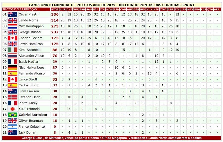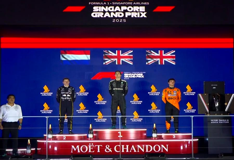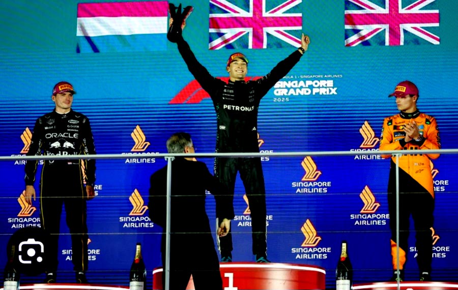 George Russell foi o grande vencedor do GP de Singapura, ocorrido neste domingo (5), na Fórmula 1. O piloto da Mercedes largou na primeira colocação, conseguiu uma grande arrancada logo nas primeiras voltas e sequer teve a liderança ameaçada durante a prova ocorrida na Ásia.