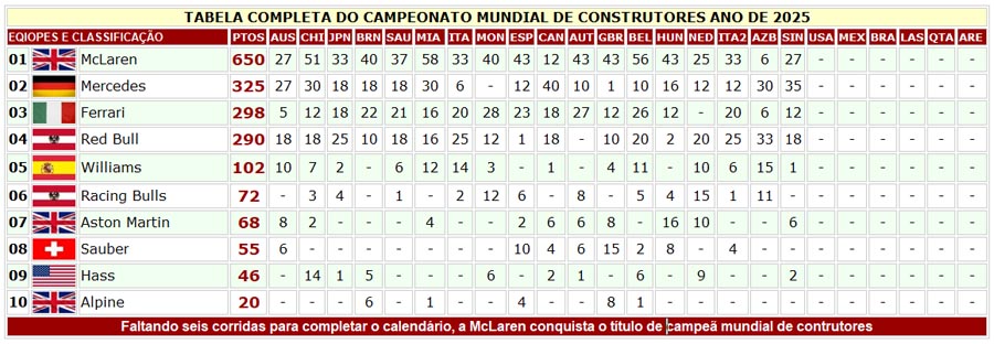 Acompanhe a evolução de pontos das equipes prova a prova – McLaren campeã mundial