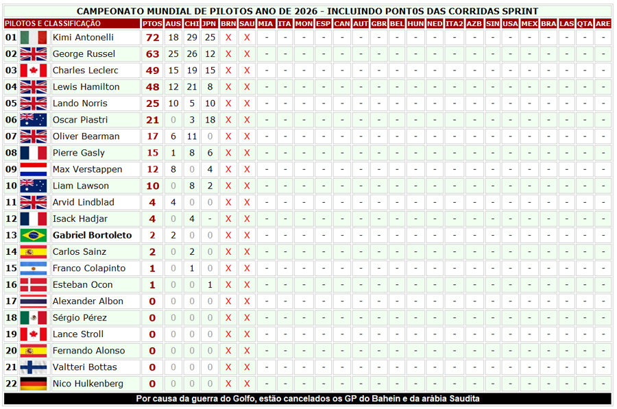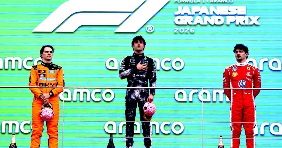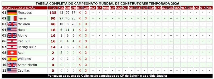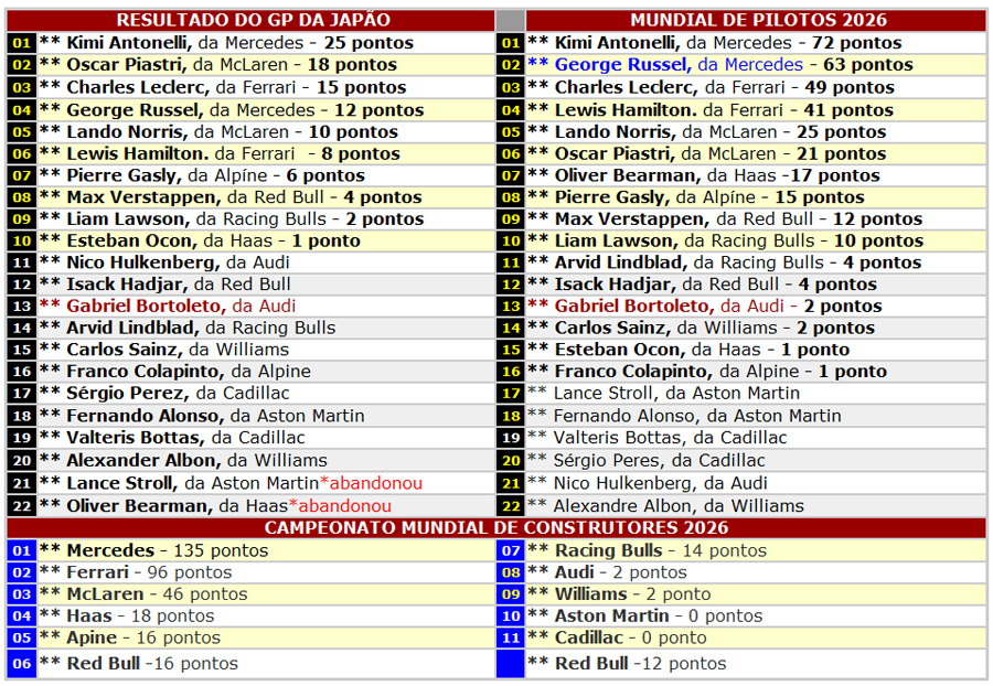 O tetracampeão mundial Max Verstappen, que disse estar “extremamente frustrado” após uma má classificação no sábado, conseguiu salvar alguns pontos ao terminar em oitavo. Liam Lawson ficou em nono lugar pela Racing Bulls, com Esteban Ocon em décimo com seu Haas. Confira a seguir, nos gráficos, o resultado final do GP do Japão, a classificação de pilotos e construtores e a próxima corrida. Por causa da guerra do Golfo, os GP do Bahrein e da Arábia Saudita estão cancelados, o que dá um trégua de trinta dias no campeonato que só retorna em maio, no dia 3, com o grande premio de Miami.